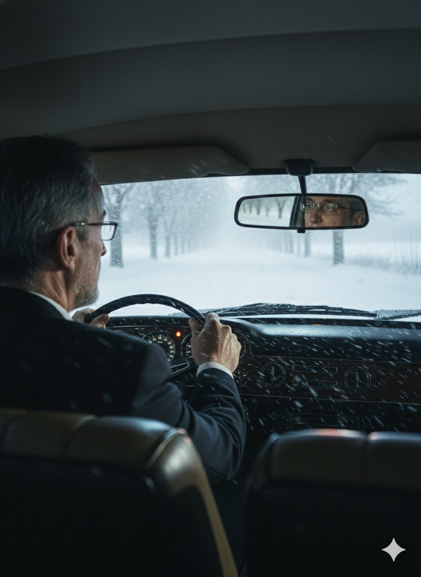 Sure enough, the day before Christmas Eve (men’s shopping days for sure), I had to travel into town during a snowstorm. On the way back, the roads were full of snow. No way you could see lines demarking lanes and cautious driving was the way to go.