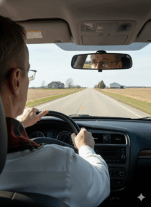 As he looked at me and I looked at him, I saw only indifference on his face; I don’t care what he saw on mine. He was hunched over his steering wheel, looking agitated, and it seemed to me, driving like an anxious woman. Drive as much as I have and you too will learn to spot the type.